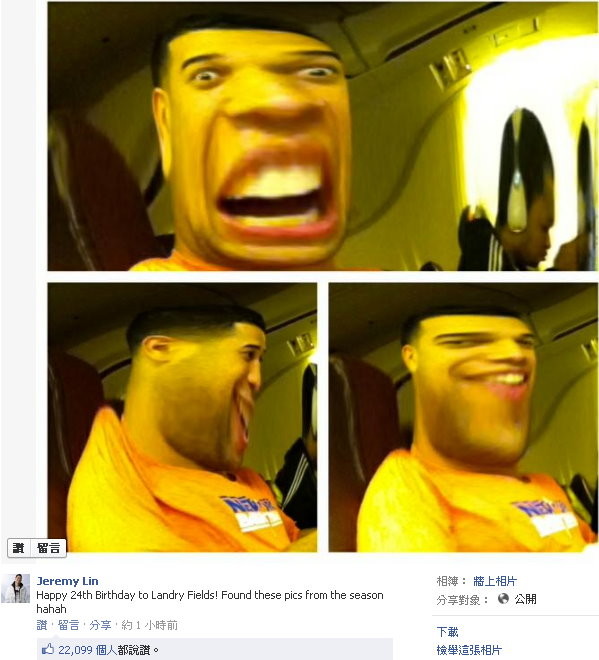 上周弟弟林書偉生日,NBA球星林書豪在臉書上PO了一張弟弟被砸蛋糕的照片,現在好兄弟費爾茲(Landry Fields)過生日,林書豪再度讓壽星「面目模糊」,PO了一張費爾茲臉孔變形三連發!