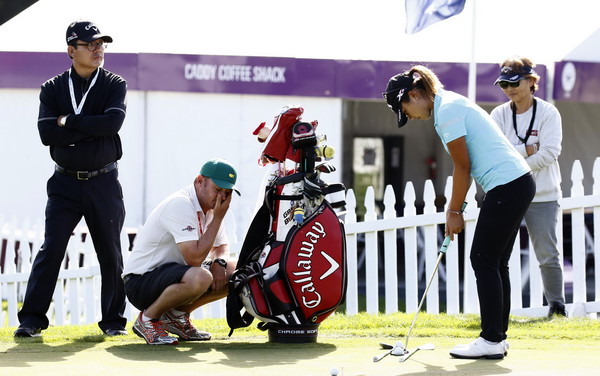 ▲企圖三連霸的高寶璟在父母親陪同下練推桿。(圖/裙擺搖搖提供)