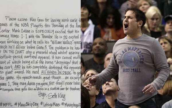 系列戰與雷霆戰成1比1平手,小牛即將回到主場作戰,老闆庫班在Instagram上PO出他寫給球迷的親筆信,表明需要小牛球迷的支持,進場替球隊加油,「嗨小牛球迷們,比賽6點開始,跟老闆說提早下班是我說的,因為我們要進場看球。」