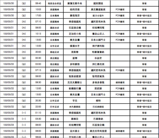 台灣運彩單場暨場中投注場次預告表(105年05月17日~105年05月23日),包含一周的單場及場中賽事及賽事焦點預告。