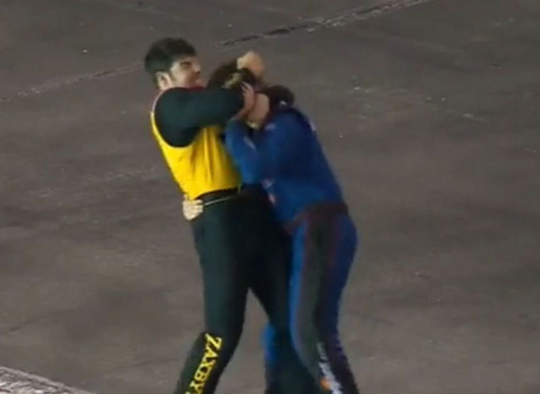 NASCAR全美房車大賽比賽刺激又火爆,出現撞車更是家常便飯。26日Camping World Truck系列賽中,兩台車互相爭道卡位,最後兩台車撞在一塊,雙方駕駛下車開幹,賽道上玩起真人格鬥,宛如WWE。