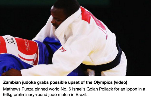 里約奧運柔道男子66公斤級出現大爆冷,世界排名112名、尚比亞選手龐扎(Mathews Punza)用不到2分鐘的時間,擊敗世界排名第6的以色列選手波拉克(Golan Pollack),晉級16強。