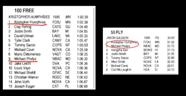 生涯共獲得23金的菲爾普斯(Michael Phelps)在泳壇的霸主地位無人能動搖。著名NBA記者達倫洛威爾(Darren Lowell)近日公佈了兩張他10歲時的比賽排名表,居然在100米自由式與50米蝶式中輸給了NBA球星Kris Humphries,到現在他還是全美記錄保持人。