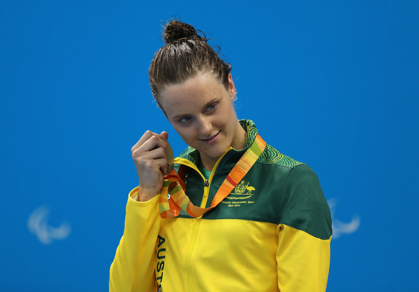 ▲澳洲游泳選手科爾(Ellie Cole)聆聽獎牌的聲音(圖/CFP)