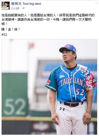 蔡英文臉書粉絲團上寫著「他是超越勝負的人,他是團結台灣的人,鋒哥就是我們這個時代的台灣精神。謝謝你為台灣做的一切,今晚,讓我們再一次大聲吶喊:陳!金!鋒!」