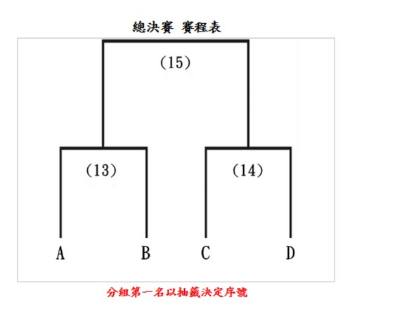 • 總決賽採淘汰賽制,比賽和局第13、14場不加時,直接比踢罰球點球決定勝負(各派5人比踢、依據足球規則辦理);第15場需加時10分鐘(分上、下半場,中場不休息),若再平手,比踢罰球點球決定勝負。