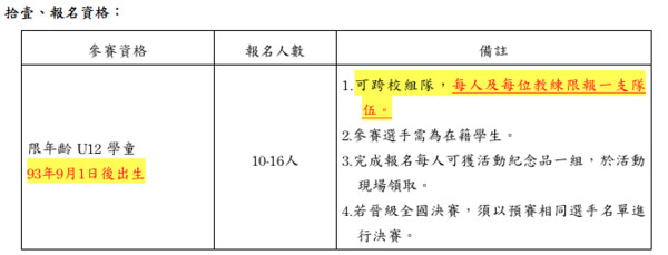 每位隊員均需攜帶身分證明文件正本或健保卡或球員證(需有可辨識相片)於報到時進行檢錄查驗,若有資格不符者,該隊將取消參賽資格。