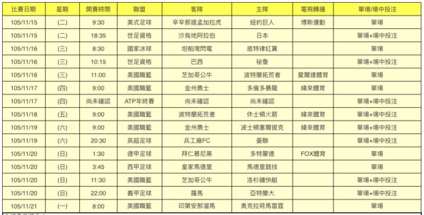台灣運彩單場暨場中投注場次預告表(105年11月15日~105年11月21日),包含一周的單場及場中賽事及賽事焦點預告。